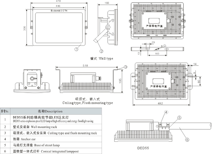 8. 壁式安裝旋轉(zhuǎn)角度可調(diào),電纜布線,吸頂式、嵌入式安裝可采用電纜或鋼管布線;